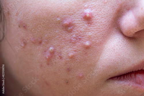 face, woman, hair, beauty, eye, people, person, closeup, expression, looking, brunette, skin, acne, pimple, blemish, sick, treatment, sad, caucasian