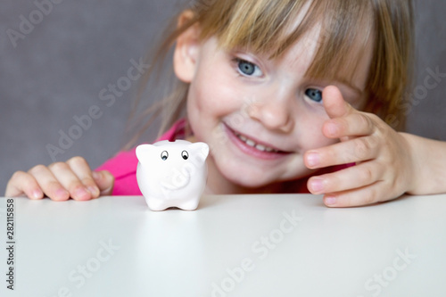 caucasian, girl, children, children, little, blond, happy, cute, smile, funny, inside, room, interior, table, laugh, baby pig, bank, money, hold, looking, front, view, grey, background, hand, blue, eye, future, education, daylight