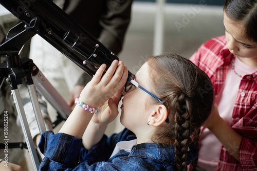 Caucasian girl with braided hair using telescope while another girl standing nearby observing activity, both appearing to be children engaged in science exploration indoors