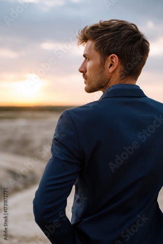 caucasian, male, adult, blue, suit, sunset, outdoors, contemplative, evening, portrait, landscape, thoughtful, sky, horizon, nature, formal, attire, stylish, elegant, back, hair, profile, tranquil, peaceful, scenic, view, dusk, professional, retreat, solitude, moody, warm, light, shadow, casual attire, look, thought, alone, natural, beauty, twilight, fashion, calmness, pensive, reflective