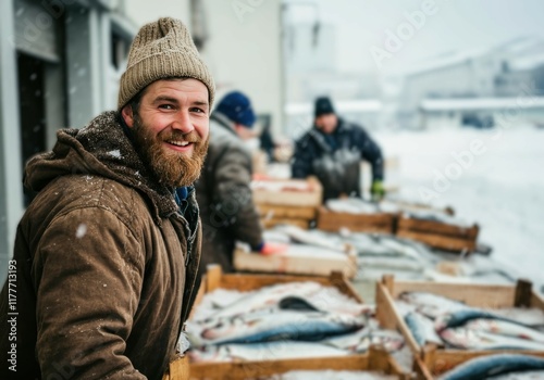 caucasian, male, adult, fish, market, winter, snow, beard, smile, men at work, crate, seafood, fisherman, hat, jacket, cold, outdoors, commerce, sale, seller, ice, box, fresh, business, trading, manual, labor, community, marketplace, industry, economy, local, catch, rural, produce, frost, snowy, interaction, team, teamwork, environment, retail, lively, stall, seasonal, supply