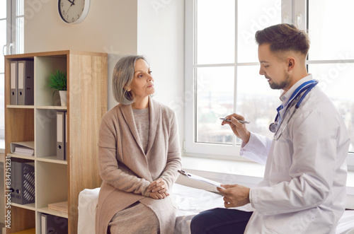 Caucasian male doctor or nurse consulting an elderly patient during a visit to the hospital office. The medical professional provides care and assistance to the senior, old individual.