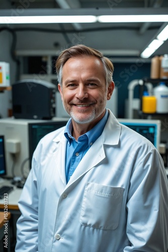 scientist, laboratory, brewery, man, white, 40s, smiling, science, research, quality control, beer, caucasian, middle-aged, male, person, professional, expert, chemist, biologist, technology, equipment, scientific, analysis, testing, manufacturing, industry, development, innovation, specialist, portrait, career, job, work, labcoat, modern, microscope, confident, friendly, smart, skilled