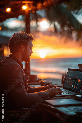 remote, work, digital, nomad, sunset, laptop, serenity, nature, sharpened, beach, workspace, freelancer, freedom, tranquil, environment, sunshine, technology, caucasian, man, young, professional, casual attire, sun, water, cloud, palm, lifestyle, island, creativity, inspiration, horizon, evening, global, travel, modern, coastal, life events, sunlight, happiness, aesthetic, solitude, wave, photo, ecosystem, entrepreneur