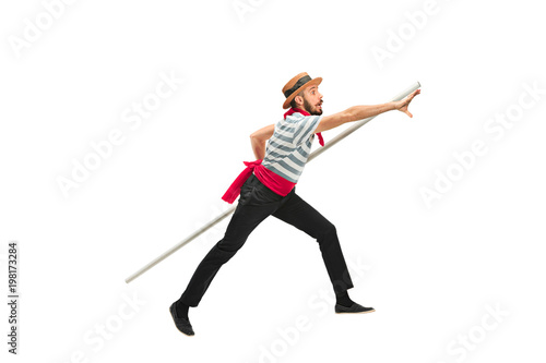 adult, black, caucasian, costume, culture, cut-out, gondolier, hair, isolated, male, man, people, front, racked, hand, foot, friendly, smile, arm, curious, interested, thoughtful, desire, optimism, optimistic, confused, confusion, shock, surprise, holding, funny, bearded, traditional, hat, paddle, studio, white, background, symbol, italy, venice, emotion, standing, smiling, happy, jumping, humor, step, profile