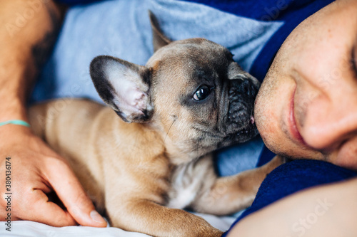Caucasian man lying in bed with a french bulldog puppy