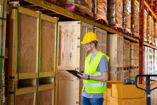 Caucasian man warehouse worker employee working and checking inventory stock on parcel shelf in distribution fulfillment center. Business industry and freight transportation logistic cargo concept.