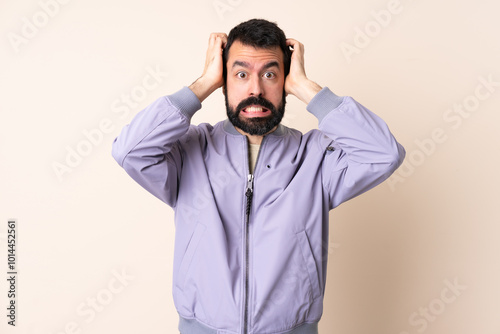 Caucasian man with beard wearing a jacket over isolated background doing nervous gesture