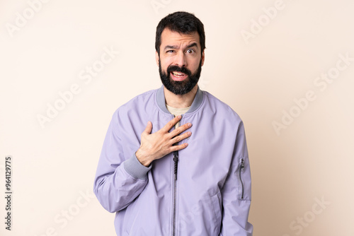 Caucasian man with beard wearing a jacket over isolated background pointing to oneself