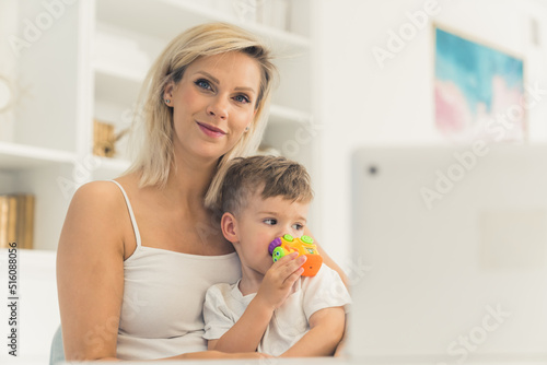 Caucasian mother and her little son sitting in front of the laptop at home, medium closeup motherhood concept. High quality photo