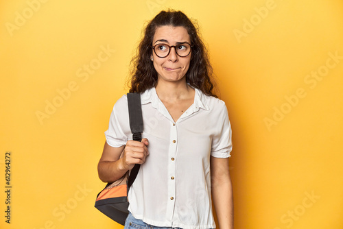 pensive, puckering, uncertain, disappointed, thoughtful, bewildered, doubt, choose, serious, uncertain, thinking, concept, dissatisfied, question, objection, confuse, lip, doubtful, ignore, caucasian, young, woman, student, university, goggles, backpack, yellow, background, studio, academic, studious, intelligent, female, scholar, intellectual, educated, collegiate, spectacle, isolated, eyewear, fashion, portrait, trendy