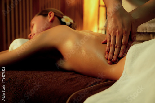 Caucasian woman customer enjoying relaxing anti-stress spa massage and pampering with beauty skin recreation leisure in warm candle lighting ambient salon spa at luxury resort or hotel. Quiescent