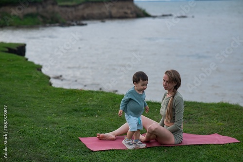 caucasian, woman, doing, yoga, little, son, outdoors, family, active, summer, mother, meditation, physical, baby, toddler, sport, lotus, outside, exercise, fitness, childhood, park, fun, happy, lifestyle, bonding, pose, together, balance, boy, body, joy, nature, love, health, mat, attractive, maternity, sportive, strength, energy, action, harmony, meadow, river bank, green, beach, landscape, water, sea