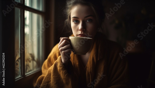 Caucasian woman enjoys hot drink by window generated by AI