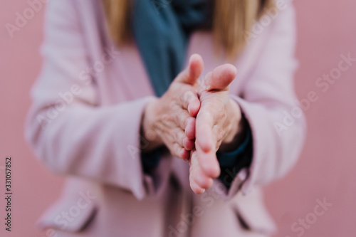 antibacterial, disinfectant, gel, soap, alcohol, woman, street, mask, outdoors, caucasian, public, adult, infection, wearing, epidemic, prevention, virus, infectious, protective, disposable, danger, pandemic, corona, pneumonia, health, disease, prevent, protection, lifestyle, infect, city, urban, stop, safety, concept, contagious, male, holding, indoor, white, coat, stethoscope, note, unrecognizable, europa, disease, pink, hand, liquid