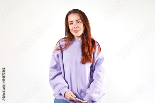 caucasian, woman, natural look, smiling, long hair, red hair, white background, expression, confident, girlfriend, sweater, hoodie, studio shot, communication, emotional, european, emotion, pretty, sweatshirt, beautiful, smile, purple, cheerful, violet, happy, fashion, orange, hair, cute, young, charming, person, background, attractive, female, copy space, casual attire, long-haired, showing, presenting, blank screen, wireless