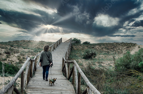 Caucasian woman walking with her chihuahua in a walkway with wooden planks in the Natural Park of Trafalgar Cape next to Canos Meca village, Barbate, Cadiz, Andalusia, Spain