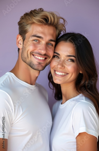 couple, smiling, caucasian, young, male, female, white, shirt, purple, background, happy, joyful, fashion, casual attire, love, togetherness, teeth, friendship, hair, style, expression, portrait, cheerful, human relationships, bonding, affectionate, bright, casual clothes, upbeat, laughter, happiness, positivity, face, eye, lovebirds, closeness, harmony, companionship, trendy, relaxed, vibrant, dynamic, fun, pleasant, delightful