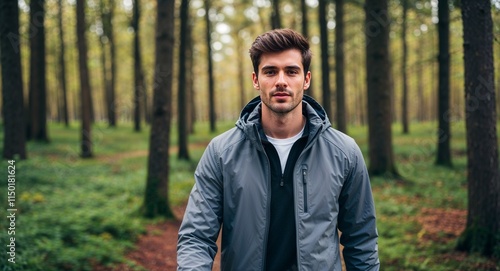 Caucasian young man walking in forest wearing gray jacket