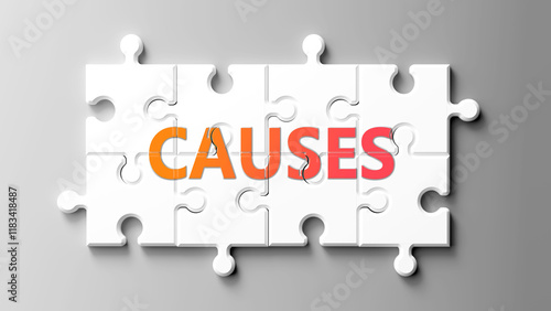 Causes complex like a puzzle - pictured as word causes on a puzzle pieces to show that causes is complex and needs cooperating pieces that fit together. ,3d illustration