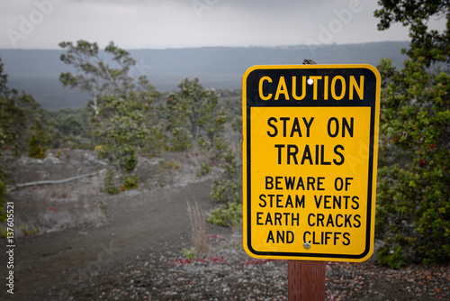 caution, signs, volcano, trail, steam, crack, cliff, warning, hiking, hawaii, tree, lava
