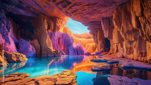 cave, water, rock, turquoise, formation, interior, canyon, cliff, landscape, geology, nature, underground, stone, erosion, cave, cavern, karst, wall, ceiling, light, depth, shadow, sky, opening, scenery, outdoors, calm, colourful, texture, layer, desert, arid, environment, purple, orange, travel, hollow, mineral