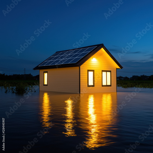 CBAM Carbon concept. A house partially submerged in water, illuminated at dusk with solar panels.
