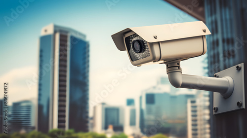 CCTV security camera in a city with business building on background