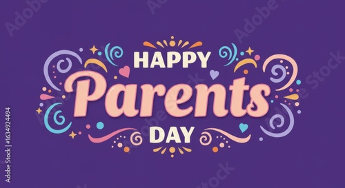 Celebrate cherished parents with vibrant 'Happy Parents Day' lettering and festive flourishes