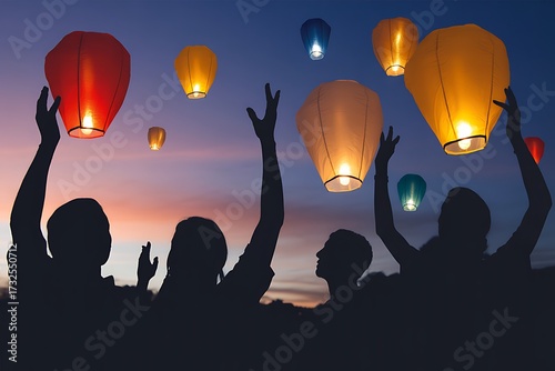 lantern, sky, night, festival, celebration, light, dusk, tradition, culture, holiday, asian, event, group, people, flying, glowing, colourful, illuminated, happiness, joy, freedom, friendship, together, community, travel, adventure, vacation, tour tourism, spirituality, peaceful, serene, relaxing, silhouette, family, friends, memory, dream, wish, hope, future, magical, vibrant, beautiful, peacefulness, mindfulness