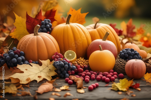 Celebrate Thanksgiving with a vibrant illustration: organic fruits adorning a table in the rich hues of Indian Summer, a feast for the eyes
