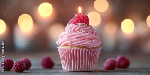 Celebrate with a delightful raspberry cupcake topped with pink frosting and a lit candle, surrounded by a warm glow of soft lights