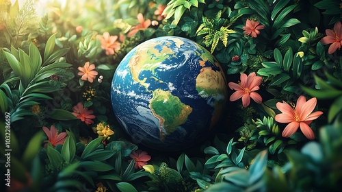 Celebrate World Environment Day a beautifully illustrated globe radiating colors of life and framed by lush greenery emphasizing ecofriendly practices and the importance of protecting our Earth