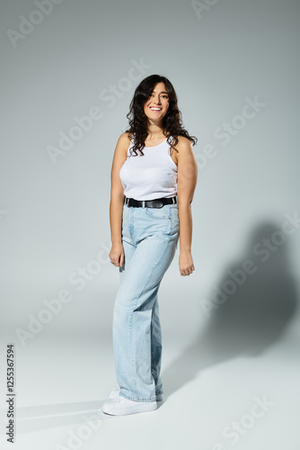 beautiful, young, woman, joyful, white, tank top, studio, grey background, caucasian, missy, casual clothes, confidence, smiling, beauty, fashion, empowerment, curvy, happiness, modern, lifestyle, expression, trendy, positivity, modelling, simplicity, personality, relaxed, graceful, stylish, personal, comfortable, warm, fresh, approachable, dream