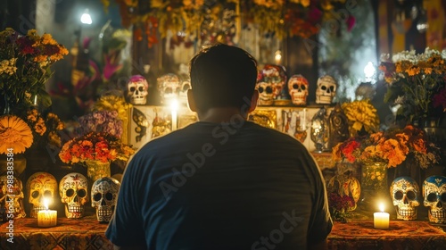 dia, los, day, of, the, dead, celebration, altar, skull, candle, flower, tradition, culture, mexico, holiday, remembrance, spirituality, ritual, devotion, vibrant, colourful, atmospheric, contemplative, solemn, reverend, festive, spiritual, reverence, commemoration, memorial, bequest, ancestry, family, community, heritage, indigenous