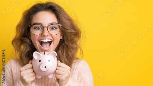 savings, woman, money box, financial success, joy, excitement, celebration, yellow, happiness, finance, goal, aspiration, prosperity, positive, investment, money, budgeting, planning, wealth, achievement, lifestyle, empowerment, growth, cheerful, education, strategy, confidence, secure, future, income, sharpened, dream, support, cognition, motivation, determination, personal finance, awareness, modern