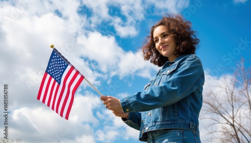 Celebrating freedom young woman waves american flag outdoors daylight joyful nature