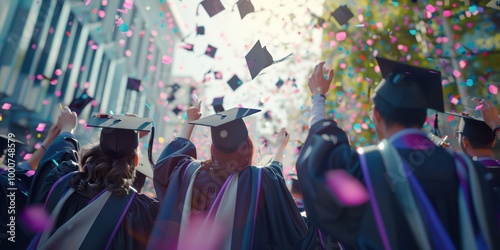 graduation, celebration, student, graduate, ceremony, cap, gown, confetti, achievement, success, education, college, university, happiness, joy, excitement, future, opportunity, cognition, learning, aspiration, determination, pride, accomplishment, triumph, ceremonial, festive, group, people, togetherness, gathering, event, daytime, bright, colourful, happy, joyful, energetic