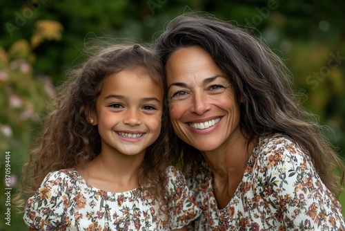 Celebrating Mother's Day with a joyful mother and daughter sharing smiles in a beautiful garden, capturing love and happiness in a heartwarming moment, family bond concept