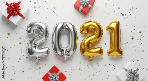 Celebration 2021 New Year's Festive Composition Presents Gold Silver Balloons Confetti White Background Holiday Season Festive Theme