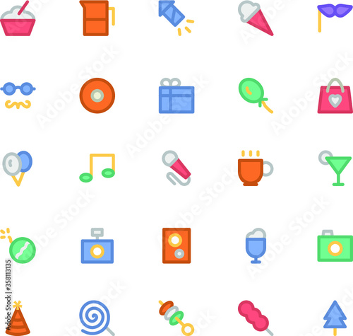 bowl, noodle, pitcher, fireworks, cone, carnival, festival, goggles, balloon, shopping, bag, microphone, juice, explosion, camera, cup, photo, lollipop, bar-b-q