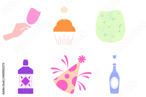 celebration, party, drink, alcohol, cupcake, champaign, wine, soda, party hat, purple, pink, orange, green, light green, illustration, graphic design, festive, joyful, happy, birthday, anniversary, toast, bubbly, sparkling, textured, hand-drawn, vector, clip art, design element, holiday, event, fun, beverage, dessert