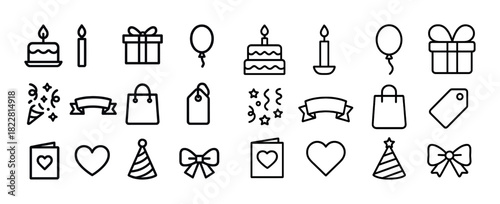 icon, celebration, cake, gift, balloon, heart, party, line, art, style, birthday, present, candle, festive, shopping, bag, tags, card, hat, ribbon, bow, confetti, banner, outline, design, collection, set, black, white, minimal, symbol, decoration, fun, joy, illustration, graphic, vector, elegant, simple, element, pack, cheerful, isolated, shape, creative