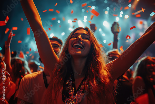 concert, celebration, crowd, joy, music, entertainment, excitement, festival, performance, energy, night, light, confetti, smiling, fun, people, happiness, dancing, togetherness, thrill, event, artist, audience, vibe, sound, friends, oneness, atmosphere, cheering, rythm, nightlife, enjoyment, passion, young adult, exhilaration, spontaneous, elation, community, love, fellowship, summer, engagement, enthusiasm, beat, socialising, memory, experience