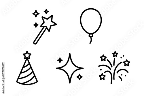 celebration, party, icon, set, birthday, new year, event, holiday, fireworks, balloon, hat, magic wand, sparkle, star, vector, illustration, line, outline, symbol, graphic, design, element, festive, minimalist, simple, pictogram, signs, editable, collection, isolated, thin, anniversary, carnival, surprise, joy, fun, confetti, web, app, congratulation, greeting