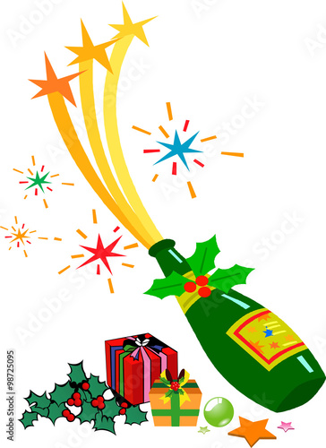 champaign, bottle, celebration, gift, box, gift box, gift wrap, celebration, fireworks, white background, illustration, drawing
