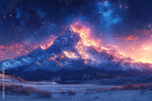 mountain, night, sky, snow, winter, star, landscape, aurora, peak, vale, alpine, glacé, wilderness, scenery, cold, natural, terrain, view, dusk, cloud, zenith, cosmic, dreamlike, serene, frosty, altitude, climate, horizon