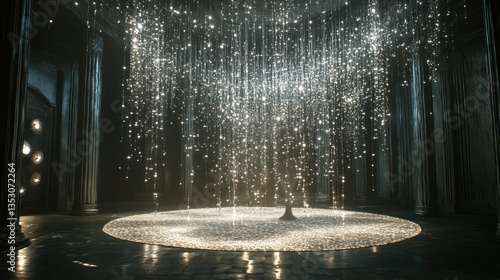 celestial, cascade, light, installation, art, sculpture, design, architecture, interior, dark, moody, dramatic, elegant, luxurious, glittering, sparkling, shimmering, reflective, abstract, modern, contemporary, minimalist, atmospheric, mystical, aethereal, serene, tranquil, column, pillar, hall, room, space, floor, circle, crystal, glasses, bead, string, hanging, suspension, illumination, glow, shine, brilliance, glamour, fantasy, magical, wonder