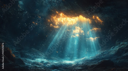 cave, underwater, light, ray, celestial, mystical, magical, fantasy, dreamlike, ocean, deep, dark, blue, gold, rock, water, particle, shine, glow, divine, heavenly, spiritual, serene, calm, peaceful, tranquil, hopeful, enigmatic, sublime, awe, wonder, mystery, secret, hidden, sacred, atmosphere, image, art