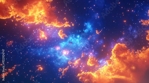 cloud, sky, space, star, nebula, cosmic, orange, blue, fiery, glowing, night, galaxy, celestial, vibrant, colourful, fantasy, artwork, digital, art, illustration, abstract, texture, background, pattern, light, dark, energy, power, mystical, magical, dreamlike, surreal, atmosphere, wonder, beauty, awe, majestic, infinite, huge, universe, cosmos